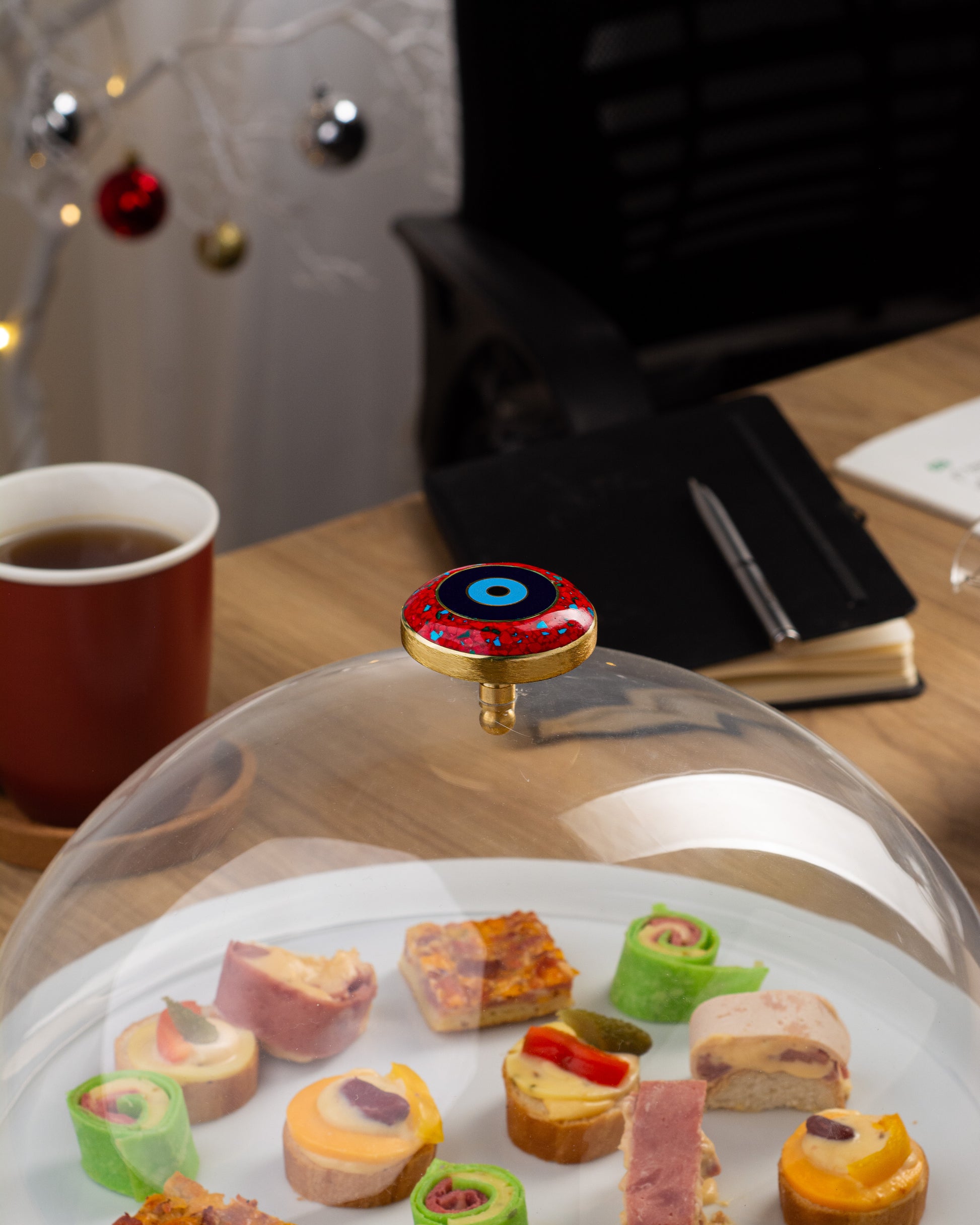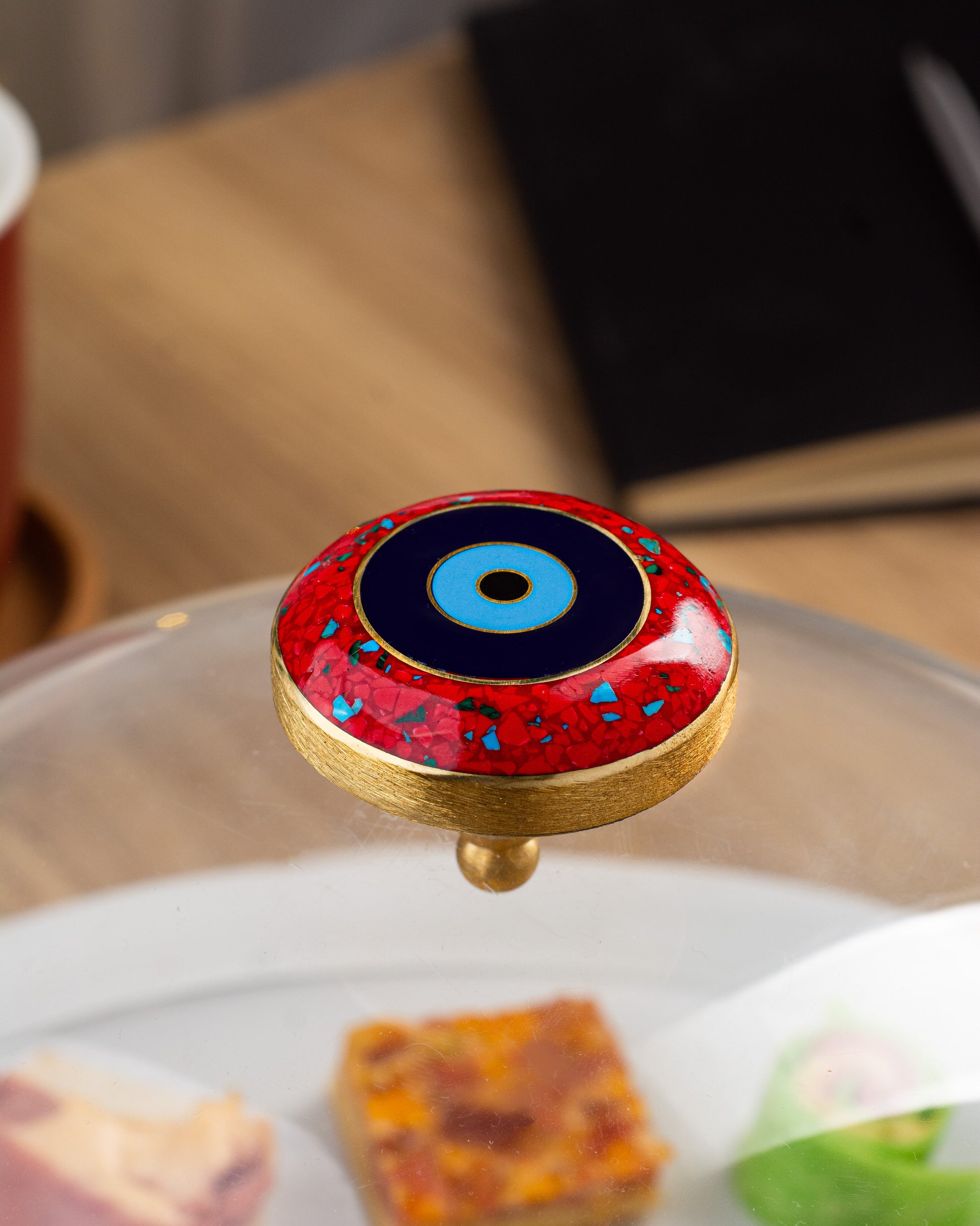 Crowning the piece is a striking round evil eye knob, meticulously handcrafted from warm copper and inlaid with a stunning mix of black and white seashell mother of pearl. The natural iridescence of the shells creates a captivating contrast, adding depth, symbolism, and a luxurious artistic touch. This handcrafted detail transforms the plate into a functional work of art—bringing together cultural protection motifs and contemporary elegance.