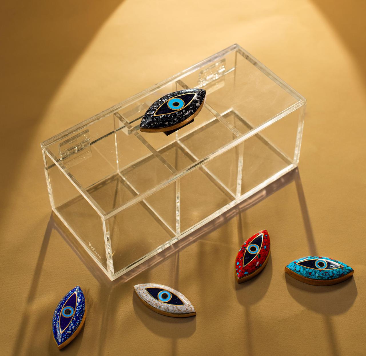 Handcrafted from premium plexiglass, its sleek, transparent form reflects modern simplicity, while the crown — a sculpted oval copper knob inlaid with shimmering black seashells — forms the shape of the iconic evil eye, symbolizing strength, clarity, and protection.